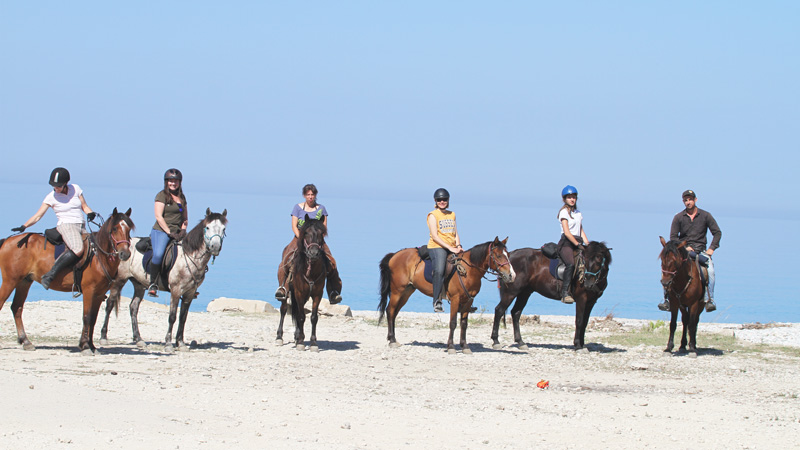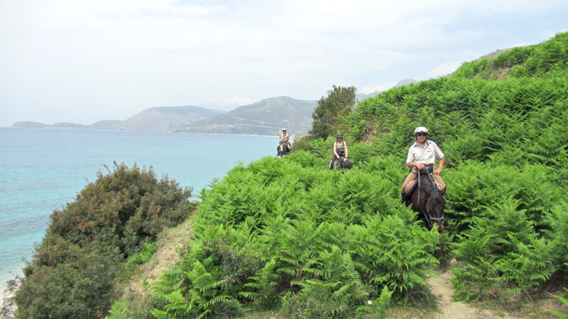 Dag 5: Börja er dag med en härlig frukost på terrassen, med utsikt över Joniska havet. Traditionella kustdelikatesser såsom byrek (ostpaj), kakor, smör, färsk mjölk och honung kommer att serveras. Dagens ridning tar er genom olivträdsterrasser, som erbjuder magnifika vyer över havet. Ni kommer att rida längs Bunec-stranden, ett orört stycke sand och småsten, och njuta av den friska brisen från havet.