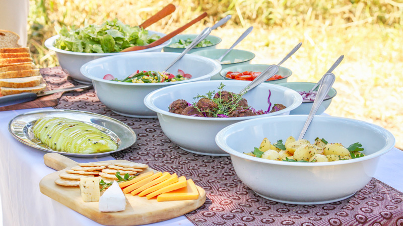 Frukosten är vanligtvis lätt och intas innan gryningen! Lunchen kommer att vara något kallskuret med färska sallader, frukt, ostar och hembakat bröd. Middagen är en riklig tre rätters med gott om färska grönsaker och god valfri dryck. Ingen risk att du går och lägger dig hungrig.