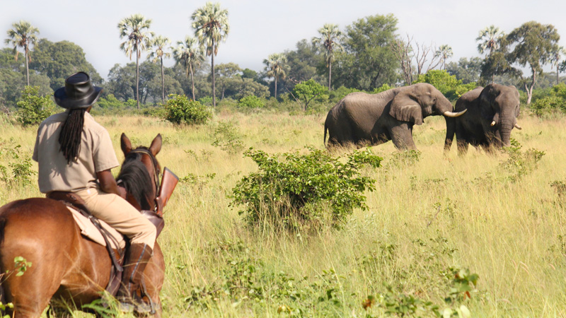 Att utforska denna vildmark på hästryggen är väldigt spännande, i synnerhet ett första möte med elefanter - en upplevelse som skiljer sig totalt från när man sitter i en jeep.