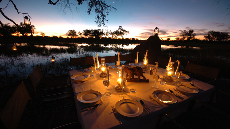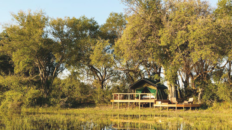 Dag 1: Du blir mött på Mauns flygplats och får hjälp med att hitta det mindre planet som tar dig till campen (antingen en Cessna 206 eller 208). Flygturen tar cirka 30 minuter och du får se deltat från ett fågelperspektiv - det är fantastiskt hur små elefanterna ser ut från luften. En jeep väntar på dig vid landningsbanan för att ta dig de sista 45 min. till lägret – eller en spännande båttur (beroende på årstid). Väl framme välkomnas du med en drink. Efter att du har installerat dig i ditt tält bjuds du på eftermiddagste och hemlagad kaka under en briefing från din guide. Därefter blir det en bushwalk med din guide och du får njuta av den vackra solnedgången och kan få ut det mesta av de fotomöjligheter som erbjuds av kvällsljuset. Efter en varm dusch, serveras drycker och tilltugg i den bekväma cantinan innan en god middag serveras.