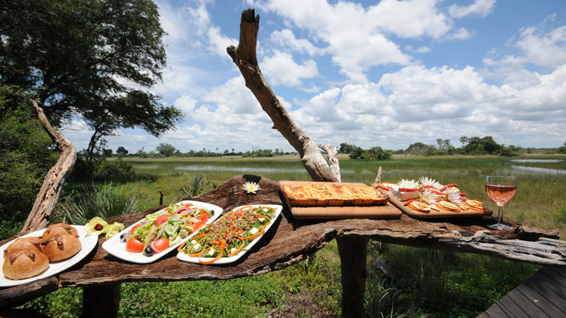 En bra lunch serveras varje dag - du behöver det för att orka med alla aktiviteter - kycklingpaj är en favorit och vin serveras alltid för att uppmuntra till en siesta före te och kaka. Eftermiddagsaktiviteterna är lugna och inkluderar ofta mokoro-turer (kanoter) som används av de lokala fiskarna i deltat - som gör att du kan ta dig över översvämmade gräsöar. Detta är det perfekta tillfället att ställa frågor och ta bilder. Krokodil observationer är inte sällsynta och fågellivet är ett av de bästa i världen. Sundowners serveras ofta i bushen innan det är dags att återvända till campen för en dusch. Middagen är alltid speciella på Macatoo, men det finns ingen garanti för att den alltid intas på samma ställe .......
