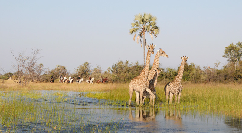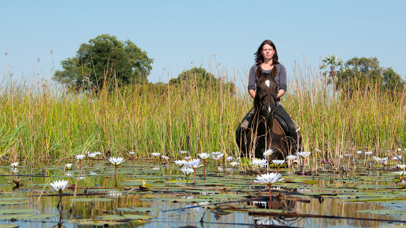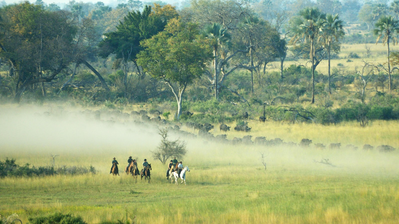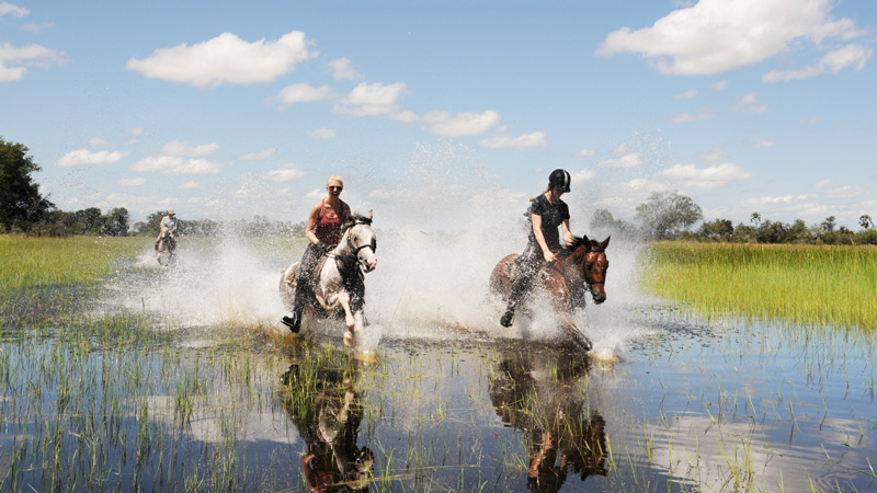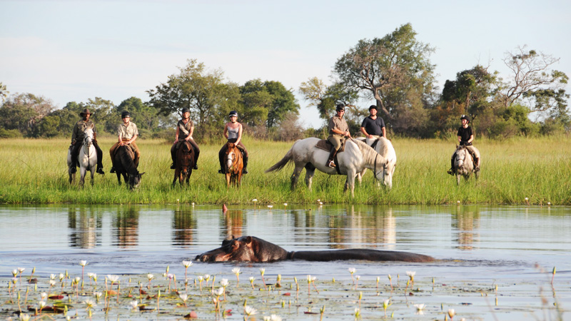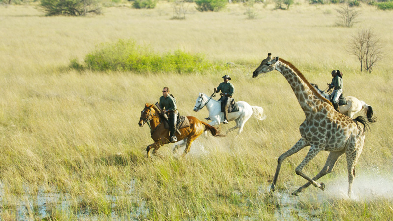 Det finns inget bättre sätt att få uppleva Okawango Deltat på, än på hästryggen. Att Deltat är ett av Unescos världsarv kommer du snabbt förstå. Den årliga översvämningen av området lämnar stora delar av Deltat otillgängliga för fordon, vilket gör hästar till det mest naturliga och bästa sättet att ta sig fram på. Ridtempot varierar mellan snabba och spännande galopper tillsammans med giraffer, zebror och antiloper, i vatten och på land, och att andäktigt stillastående iaktta t.ex. bufflar och elefanter. De erfarna guiderna är fulla av fascinerande berättelser om det ständigt föränderliga landskapet, dess flora och fauna, och har en otrolig förmåga att upptäcka även de bäst kamouflerade djuren.