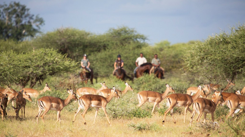 Dag 4: Hela förmiddagen utforskar ni sandstensformationerna inklusive den berömda Salomos Wall. Forntida civilisationer hyste sin rikedom bland dessa kullar där de två mäktiga floderna, Limpopo och Motloutse möts. Denna slående topografi är gammal och tidlös, och i kombination med det afrikanska djurlivet är det verkligen en vacker ridupplevelse. På eftermiddagen beger ni er till den arkeologiskt rika Mmamagwa berget. Efter en kort lätt klättring belönas ni med en hisnande 360 graders vy över reservatet och med en drink i solnedgången är detta något du kommer att minnas länge framöver.