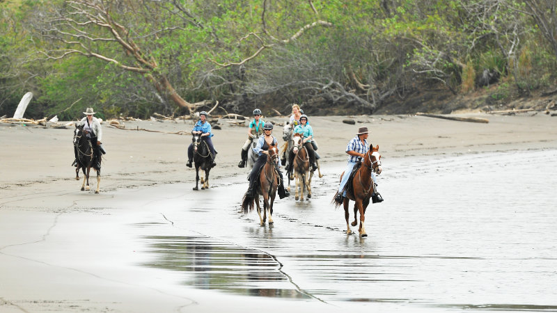 Morgonritten tar dig över haciendans 1000 acres och dess privata reservat, du rider över böljande kullar och savanner mot den frodiga Galleri-skogen. Terrängen här är pittoresk, huvudsakligen platt med mjuka sluttningar och skogklädda dalar. När du rider över de högre områdena får du utmärkta vyer över Stilla havet och kanske ser något av det lokala djurlivet. Tillbaka vid haciendan i tid för lunch och avkoppling. På eftermiddagen erbjuds en valfri ridning i den södra delen av haciendan. Efter några mjuka backar kan du uppleva en solnedgång med havsutsikt – Stilla havskusten är känd som en av världens bästa platser för att uppleva denna vackra händelse.