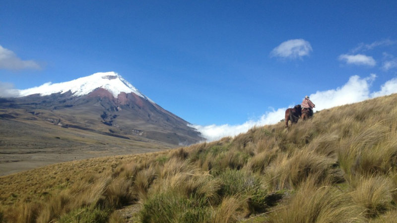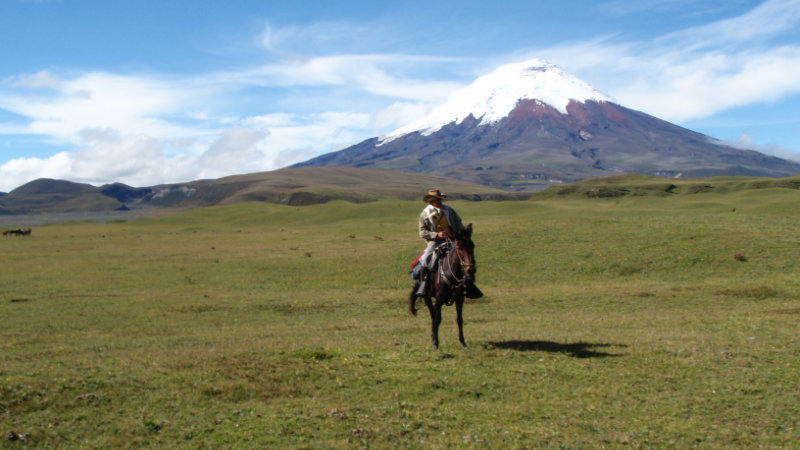 Den andra delen av ritten besöker ni den färgglada marknaden i Machachi på er väg där du kan njuta av den unika skönheten på en marknad i anderna samt få möjlighet att köpa hantverk eller läderverk. Ni fortsätter sedan ritten till Cotopaxi, den högsta aktiva vulkanen i världen (5.987m). Cotopaxis imponerande symmetriska kon leder er framför sina omgivande kullar. Ni rider runt Rumiñahui massiva stenar och till slätterna nära Cotopaxi.