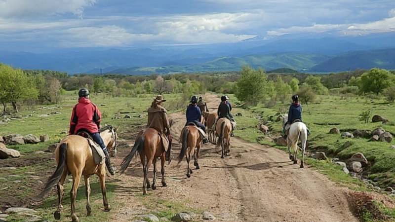 Dag 3 - Efter en tidig frukost hämtas ni från hotellet och körs cirka 1 timme till stallet nära byn Asureti för att träffa hästarna och guiderna och förbereda er för ritten. Ni börjar att rida mot byn Asureti och sedan genom låglandet och foten av skogar med ek och avenbok. Fortsätt genom dalar av vilda blommor och öppna ängar, korsa floden Algeti och stanna sedan för en picknicklunch vid byn Golteti (ca 3 timmars färd) och på eftermiddagen vidare mot den lilla staden Tetri Tskaro (Vita våren), upp i de skogsklädda kullarna till byn Gudarekhi, där lägret är uppställt, med sitt 1500-talstorn och en härlig utsikt över Algeti-dalen. Middag och natt i lägret (ca 3 timmars färd).