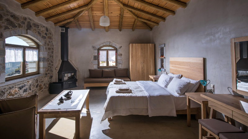 Unika rum: Varje hus är unikt inrett med lokala möbler och dekorativa detaljer som speglar den kretensiska kulturen. Rummen har bekväma sängar, vackra textilier och ofta traditionella eldstäder.
