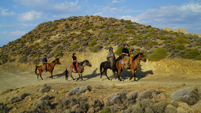 Dag 6: Ni äter frukost i klostrets trädgård, sadlar hästarna och ger er av mot Agios-Ioannis, nära de antika utgrävningarna av Phaistos. Er väg följer över klipporna ovanför den branta kusten längs en smal, ibland klippig stig, omgiven av träd. Vissa passager måste hästarna ledas på grund av markförhållandena. Ni belönas med hisnande vyer över den branta kusten, klippor och grottor. I Agios-Ioannis har ni möjlighet att simma i havet och njuta av en läcker lunch. Därefter tar er en bred serpentinväg er tillbaka till byn och stallet, som ni når på eftermiddagen. Ridtid minst 5 timmar.