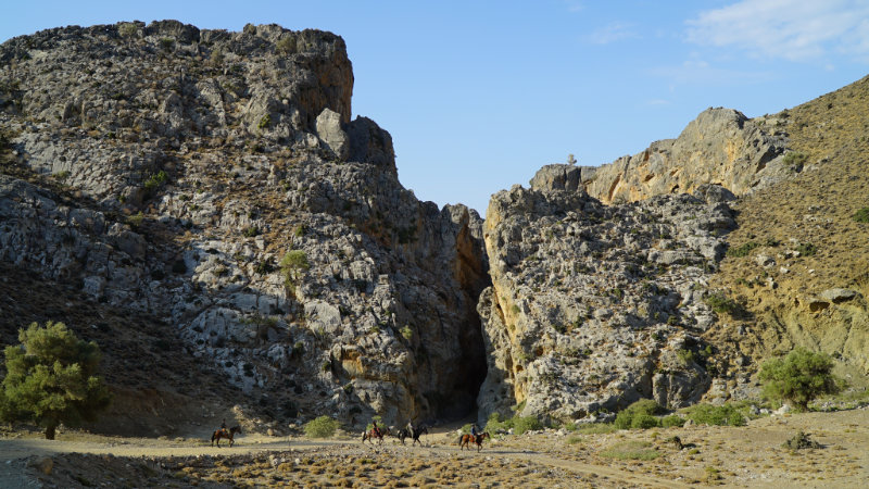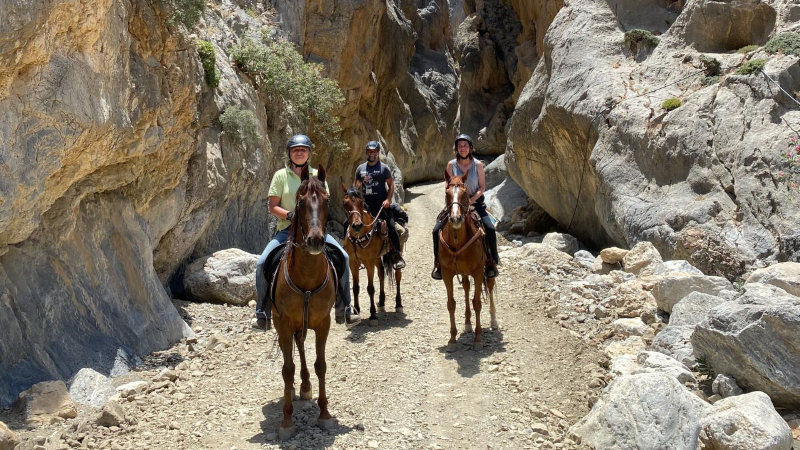 Dag 3: Idag rider ni mot väst till Tripiti-ravinen. Det är Kretas näst största ravin, uppkallad efter en kyrka i en grotta vid ravinens fot, som bara nås via omarkerade stigar. Ni gör en paus vid en magisk plats med kapell och rester av en minoisk bosättning. Sedan fortsätter ni nedåt genom klippor, knotiga olivträd och kargt betesland med får och getter, alltid med havsutsikt. Ridturen genom ravinen är hisnande med höga klippor på båda sidor av de smala stigarna. När ni når ravinens slut kan ni svalka er i havet. Lunchen intas på en restaurang. Senare återvänder ni längs en liknande väg tillbaka till stallet, där de långsamt stigande breda vägarna bjuder in till några galopper. Ridtid: ca 5-6 timmar.