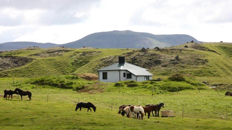 Er andra riddag tar er närmare höglandet. Ni rider på gamla vikingaleder, omgivna av gammal lava och lila lupinfält, med en lös hästflock. Ni följer grusvägar och mjuka gräsvägar uppåt och stannar nära Keldur, den största bevarade torvgården i södra Island, som härstammar från 1200- eller 1300-talet. Därefter fortsätter ni uppåt tills ni når fjällstugan vid floden Eystri-Rangá. Här kommer ni att tillbringa de kommande två nätterna.