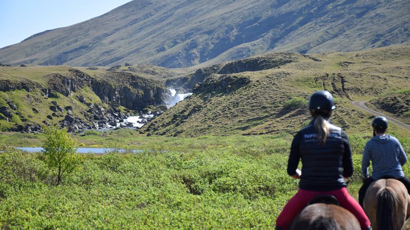 Idag tar ni varsin häst och lämnar hästflocken bakom er för att ytterligare utforska det vackra landskapet runt Foss. Vi. Ni får njuta av fantastiska vyer över bergen, lavafälten, floderna och kanjonerna. Ni passerar en övergiven gård och besöker en konstgjord grotta som tidigare användes som fårfålla. Ni rider uppför kullarna söder om Foss, där ni möter vackra vattenfall och går in i en liten grotta som kallas Tjuvgrottan. Om himlen är klar får ni en fantastisk utsikt över låglandet och bergen.