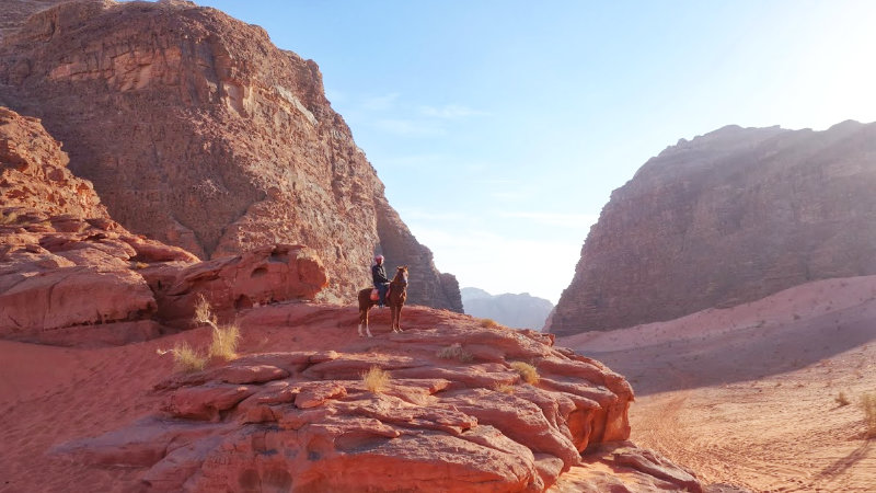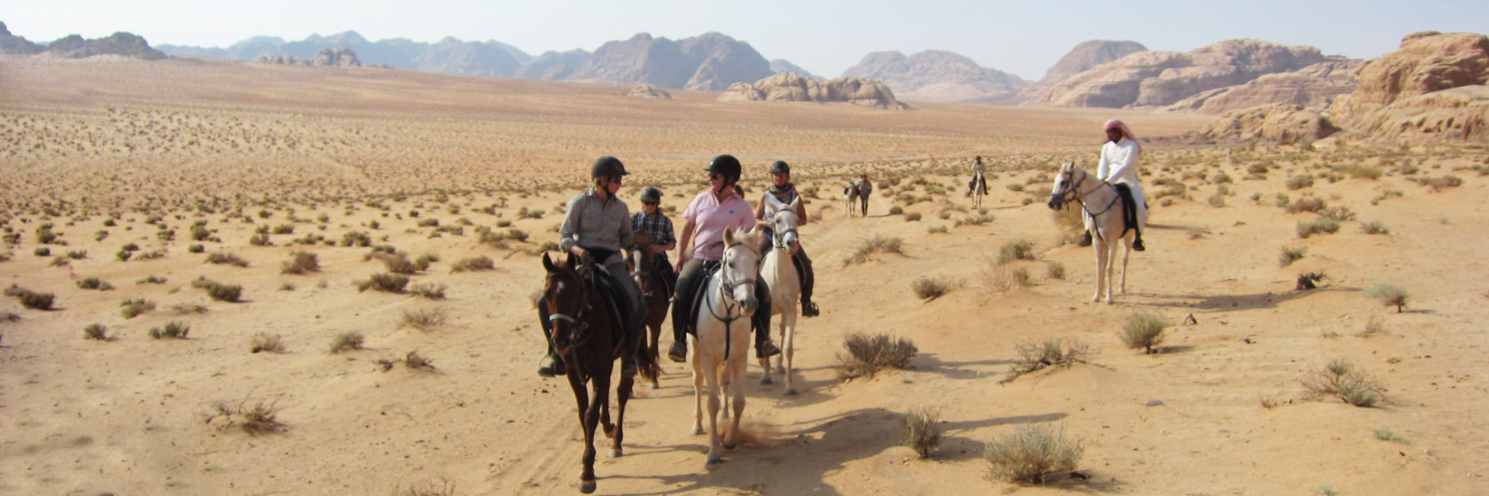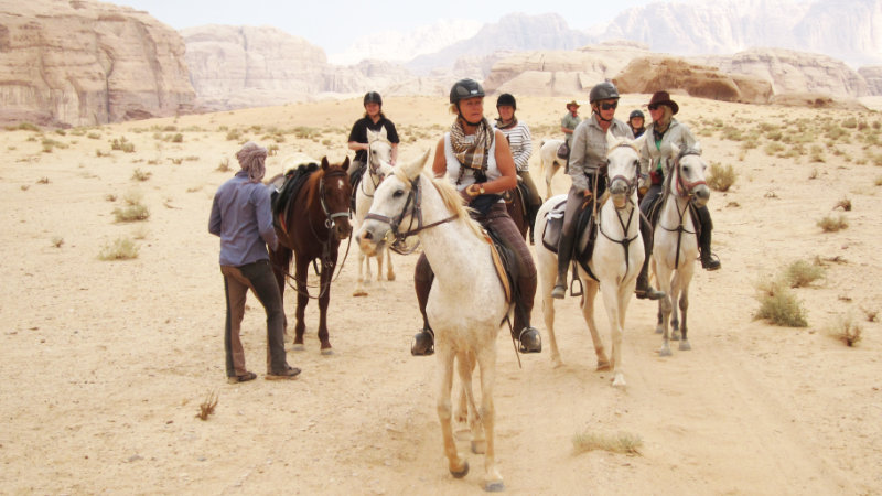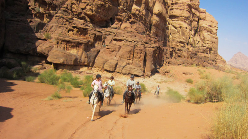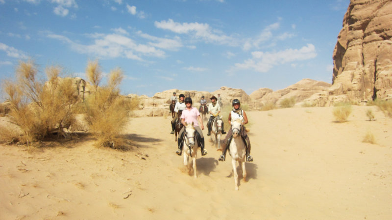 Terrängen: Wadi Rums stora ökenområde är ett fantastiskt annorlunda och vackert område att rida i. Landskapet varierar. Du kommer att rida genom ökenberg, över stora öppna ökenområden, och även genom grönt jordbruksland. Normalt är underlaget bra med hård packad sand.