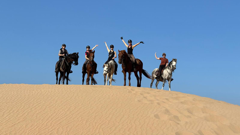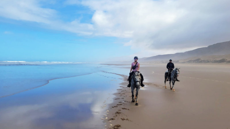 Du kan välja mellan enklare lektioner och/eller uteritter. Uteritterna bjuder på härliga galopper på den långa sandstranden eller genom små genuina berberbyar och upp i bergen med en fantastisk utsikt över kusten.