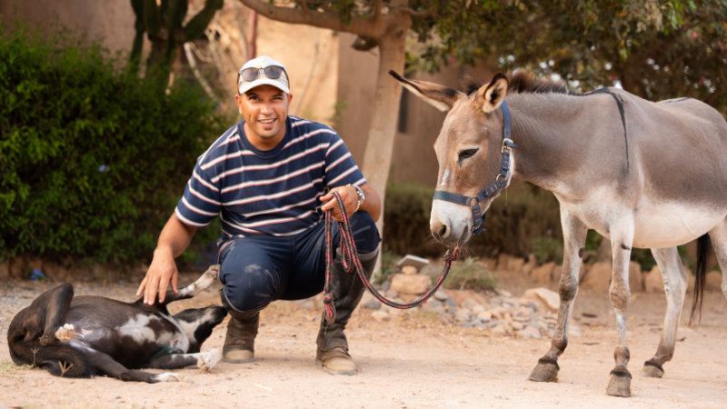 Dag 2 – Ranch – Laouina -Efter en god frukost förbereder ni era hästar och lämnar ranchen för denna första riddag. Färden går mot bergen som reser sig ovanför ranchen och havet. Ni passerar berberbyar och möter herdar med sina hjordar. Ni njuter av en picknick under arganträden. På eftermiddagen lämnar ni bergen med en fantastisk utsikt över Tiznit-slätten. Mellan jordbruksmarker och wadier följer ni bra ridvägar som möjliggör lite högre tempo. Kväll och natt tillbringas hos en lokal familj där ni får upptäcka berberkulturen och deras sätt att leva.