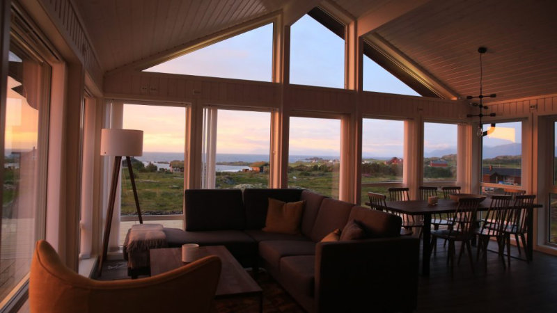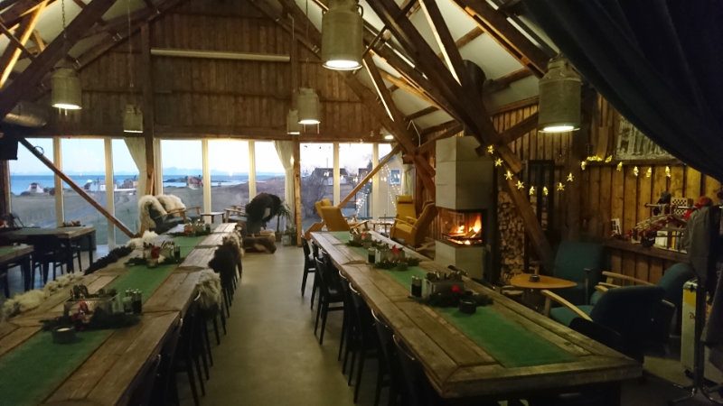 Den nordöstra sidan av ladan har stora glasfönster med utsikt över den vita Hovstranda, midnattssolen och norrskenet. Grannen Anne har gjort de vackra och mycket gedigna borden av hundra år gammalt virke från ett hus i trakten. Lamporna i taket är de ursprungliga mjölkkannorna från gården. I projektet har det lagts ner mycket tid och resurser på renoveringen av byggnaden. Den fina belysningen och takhöjden skapar en unik atmosfär. Den ursprungliga byggnaden är bevarad, samtidigt som den är modern med isolering, ventilation och ett värmesystem som håller gästerna varma och nöjda under alla årstider. En stor öppen spis i glas och mjuka retromöbler skapar en trevlig stämning även under mörka vinterkvällar. Här kan du njuta av en god måltid, med vacker utsikt, eller bara koppla av vid den öppna spisen med en god bok och öl från Lofoten.