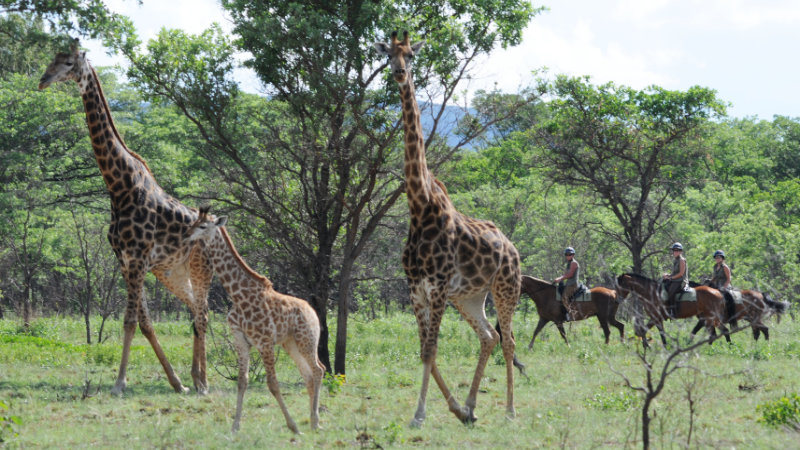 Att simma med hästarna i en av de många dammarna är ett utmärkt sätt att svalka av sig efter en lång förmiddagsritt. På ritterna i detta privata viltreservat kommer du nära vilda djur som giraff, zebra, impala, röd koantilop, eland och rörbock liksom många av de mindre däggdjur som jackal, babianer, apor och vårtsvin. Att få se dessa vilda djur till häst är en djupt berikande erfarenhet då du kan komma närmare än du någonsin trodde var möjligt, då viltet inte upplever hästen som ett hot. Guider visar dig hur man följer djurspår och lär dig lokal bushlore. En ritt till flodhästfamiljen vid sjön är alltid uppskattat.