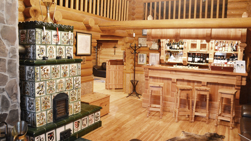 Stugan har en stor matsal och vardagsrum med bar och öppen spis samt en terrass med vedspisar.
