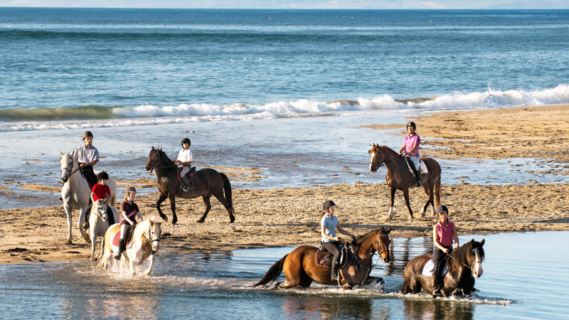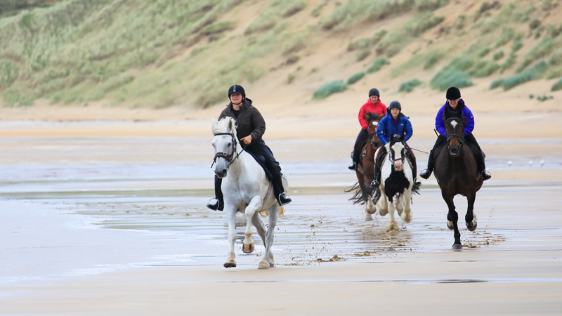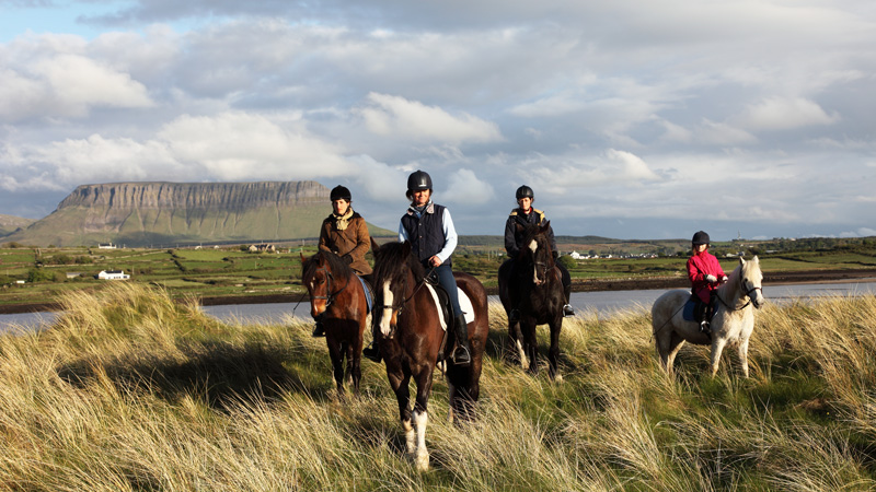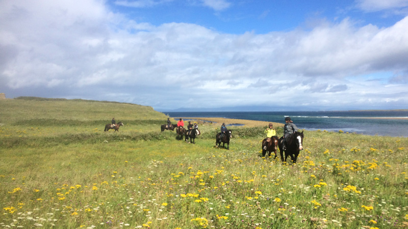 Denna dag är alla ryttares dröm; upptäck de orörda och vidsträckta stränderna på hästryggen! Det kombinerar fartfylld ridning på den vidsträckta stranden nära Streedagh-stranden där 3 Armada-skepp sjönk 1588 och en naturskön skritt över ön med en picknick bland hästarna eller ett stopp i byns kafé för mat (tidvattnet avgör vilka alternativ fungerar bäst). Känn spänningen av att korsa en atlantisk kanal till O'Connor's Island, sälar och flyttfåglar kan ofta ses i lagunen. Ni kommer in i den magiska världen på familjens privata ö och ni får se deras gamla hembygd. Följ de smala stigarna när du korsar konturerna av det stora sanddynsystemet, där natursköna utsiktspunkter dyker upp mellan sandkullarna. 360 grader av fantastisk utsikt vid horisonten – det är vackert. Detta område med särskilt bevarande är rikt på biologisk mångfald, bara de tuffaste växterna överlever exponering för de salta vindarna här, så det påminner om de vilda blomsterängarna i de höga alperna. Familjens boskapsbesättning strövar omkring på ön och du kanske träffar några hästar på deras semester vid havet. Din häst kan njuta av det salta ö-gräset medan du kopplar av, ta ett mellanmål bland hästarna och utforska platserna för det gamla gårdslivet på ön. Avgångstid beror på tidvattnet.