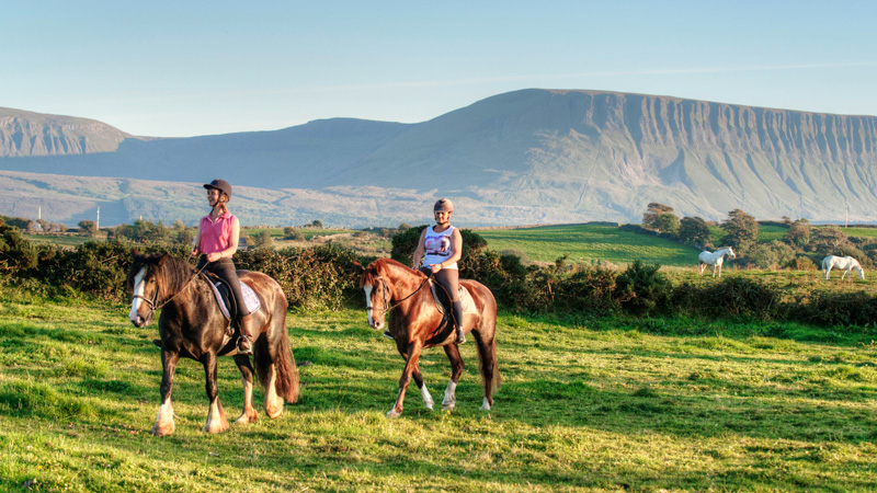 ALTERNATIV A: Det här är en låååång tur med spektakulära vyer, men också massor av skritt på asfalterade vägar! Några mil inåt landet från kusten rider ni den karga Gleniff Horse Shoe-dalen (framröstad till attraktioner som nr 1 i Ballintrillick av Trip Advisor) inbäddat under Benwiskin Mountain.