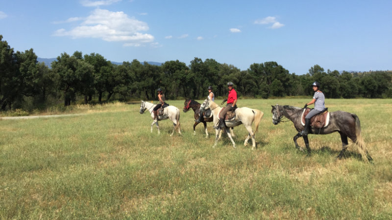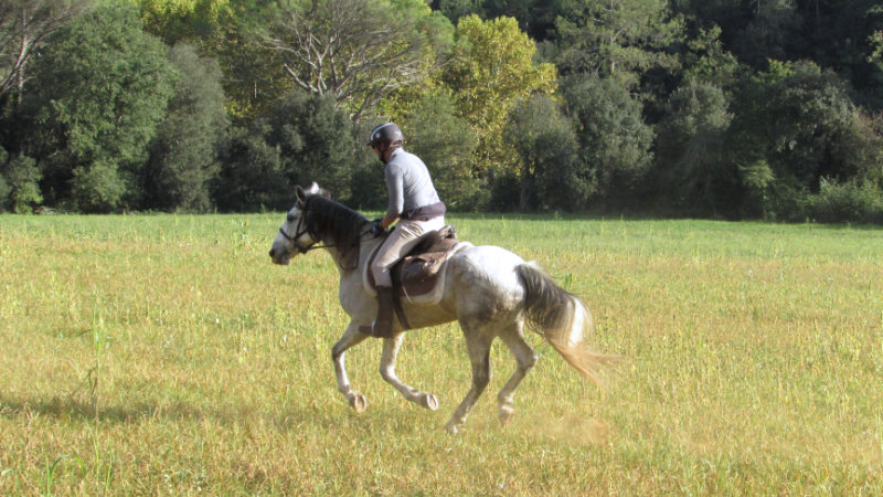 Efter frukost och sadling av hästarna lämnar ni på stigar genom Medelhavskogen. Fjällbäckarna kantar vägen och det är en vacker utsikt över bergsängar. Ni når floden Fluvià, nära byn Báscara med sin berömda hippodrom. Sedan fortsätter ni mellan olivlundar och spannmålsfält. Ni passerar bondgårdar och kyrkor, och slutligen ytterligare en galopp på breda vägar genom ek- och korkekskogen, som tar er till Galliners, där ni stannar för picknick, innan ni rider ni tillbaka till gården via byn Vilamarí.