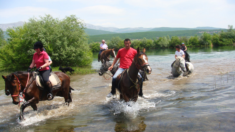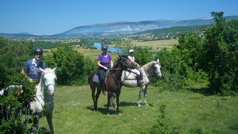 Efter frukost förbereder ni er för långritten. Ni följer floden Cetina över ängar som är väl lämpade för galopp. Sen bjuds ni på picknicklunch vid floden. Efter lunch fortsätter ritten upp på en platå som heter Bitelic. Ni rider på gamla stenlagda vägar från romartiden och njuter av utsikten över bergen Dinara och Svilaja som omger er. En gammal by Vucipolje passeras och vidare till sjön Peruca där ni kan simma med era hästar. Efter en kort paus lämnar ni sedan hästarna och körs tillbaka till gården med bil, ca 20 min, där ni äter middag.