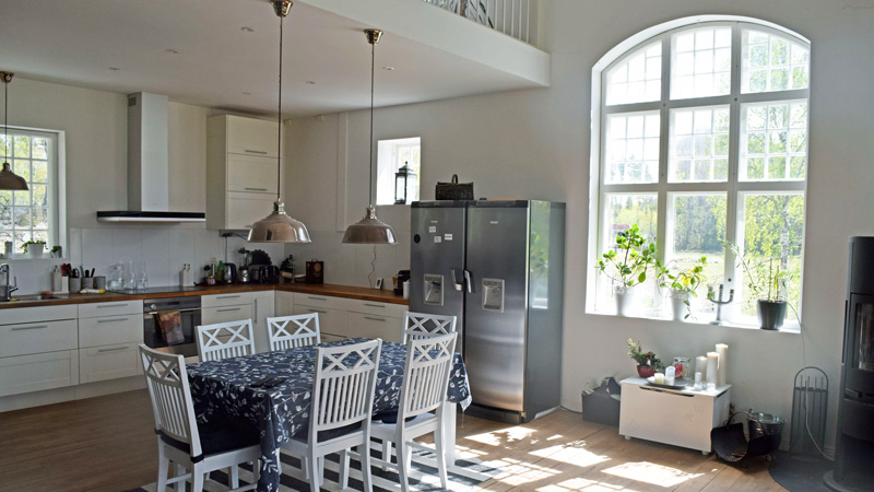 All mat serveras i det vackra boningshuset. Köket har öppen planlösning med takhöjd upp till nock. På varma dagar kan man sitta ute på den stora altanen med utsikt över sjön. Therese står för matlagningen. Frukosten är riklig och lunch och middagar är goda hemlagade mål. Varje dag bjuds du på en riktigt god efterrätt. Det går bra att ta med eget vin /öl och förvara i stallets fikarum som har kylskåp. Är du hungrig mellan måltiderna finns det alltid kaffe och te och smörgås att ta själv.